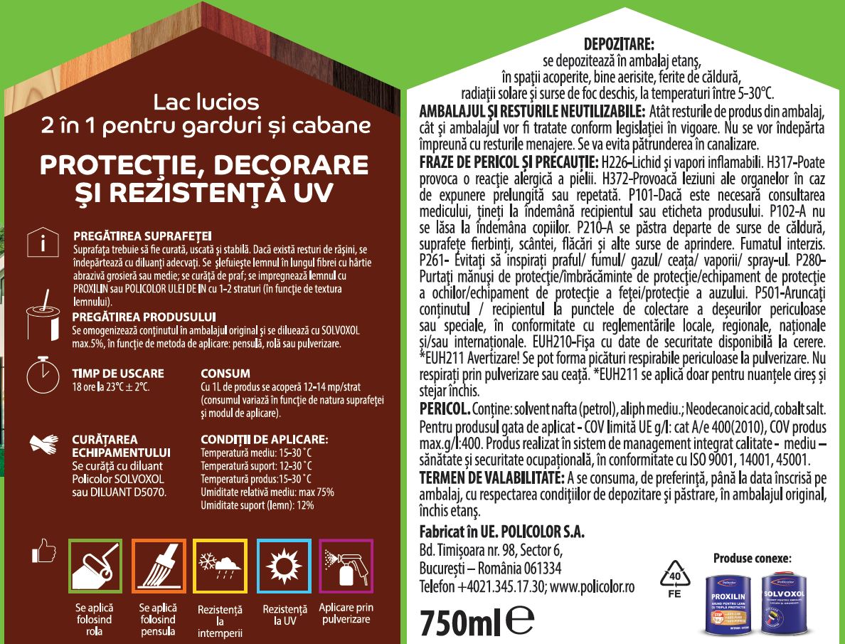 It is a 2-in-1 varnish that ensures the protection and lasting decoration of wooden surfaces, being weather-resistant. The varnish makes the surface on which it is applied last over time, and its gloss highlights the natural structure of the wood.