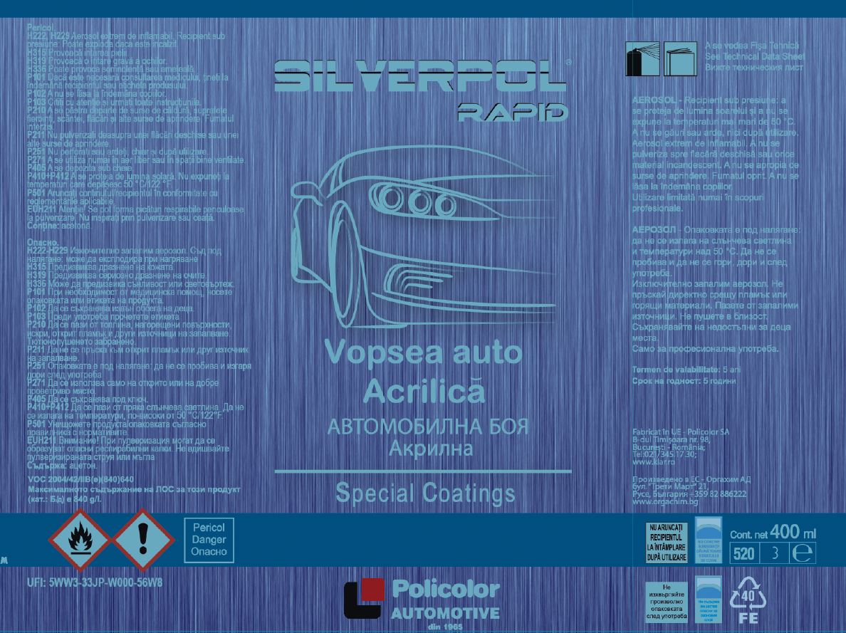 Este o vopsea acrilică auto, destinată refinish-ului auto, cu o uscare rapidă şi rezistenţă la efectul agenţilor atmosferici.