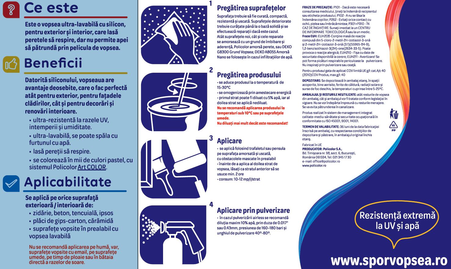 Este o vopsea ultra-lavabilă, cu silicon, pentru exterior și interior, care lasă peretele să respire, dar nu permite apei să pătrundă prin pelicula de vopsea.